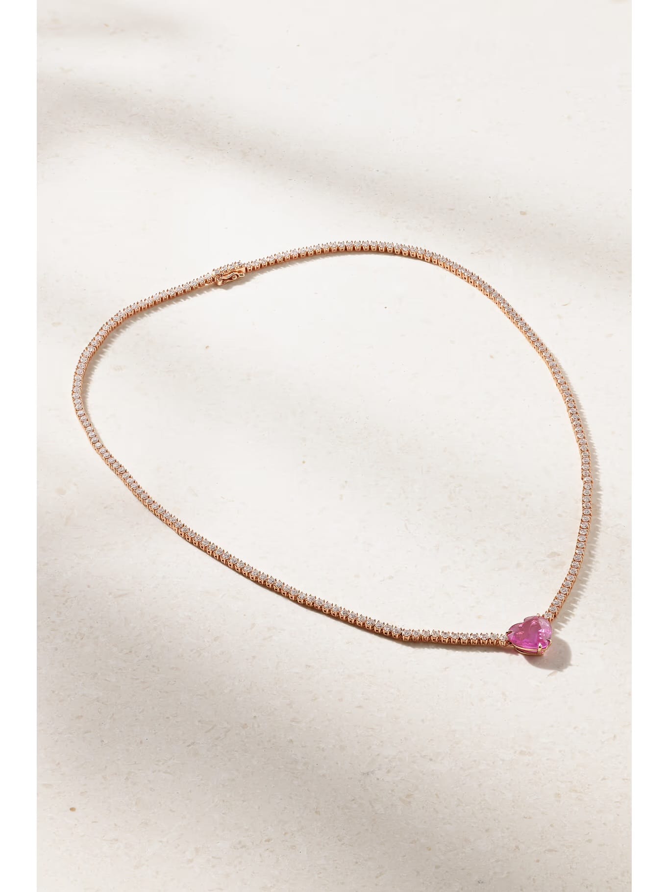 The Hepburn necklace blends diamonds with sapphires in a refined rose-gold setting. Inspired by classic cinema glamour, it works equally well for formal evenings or elevated daytime styling and reflects modern Californian luxury minimalism.